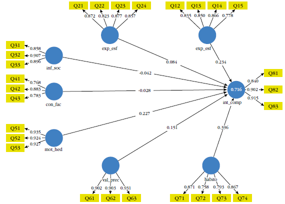 Toda vez que, según el VIF, no hay problemas de colinealidad se examina el valor del coeficiente de determinación (R2), que es una medida del poder explicativo del modelo (Hair et al., 2019), la cual oscila entre 0 y 1. Los valores más altos indican un mayor poder predictivo. Los valores de 0.75, 0.50 y 0.25 pueden considerarse sustanciales, moderados y débiles. El valor del R2 para este estudio fue de 0.716, por lo que puede considerarse muy cerca a ser sustancial o a tener un muy buen poder explicativo. Con el Q2 se busca valorar la relevancia predictiva del modelo estructural. El valor de Q2 fue de 0.539 y, según Hair et al. (2019), los valores superiores a 0.50 representan una grande precisión predictiva del modelo de ruta PLS.