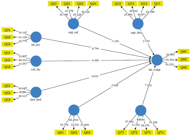 Resumo: As compras on-line se estabeleceram como um modelo de negócios predominante. O número de compradores on-line no mundo aumentaram: em 2017, 1270 milhões de pessoas; em 2018, 1380 milhões de pessoas; e em 2019, 1480 milhões de pessoas. Na Colômbia, o comércio eletrônico em 2020 aumentou 31 % em relação a 2019, e as vendas do comércio eletrônico representaram 1.8 % do PIB. O objetivo deste artigo é identificar os fatores determinantes da intenção de compra on-line dos consumidores de Boyacá (Colômbia), com base no modelo da teoria unificada de aceitação e uso de tecnologia (UTAUT2). Com um questionário on-line, foram coletados dados de 171 pessoas. Foi utilizado o modelo de equações estruturais (SEM), abordagem PLS-SEM, e sua análise revelou que as variáveis hábito (t = 7.292; p = 0), expectativa de desempenho (t = 3.153; p = 0.002), motivação hedônica (t = 3.019; p = 0.003) e valor por preço (t = 2.620; p = 0.009) são significativos na intenção das pessoas de fazer compras on-line. As variáveis condições facilitadoras, expectativa de esforço e influência social não são significativas para tal comportamento.