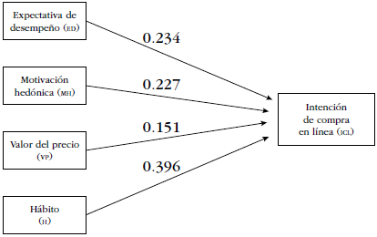 Según el análisis de la información recolectada, los factores determinantes para la intención de realizar las compras en línea por parte de los consumidores son hábito, expectativa de desempeño, motivación hedónica y valor del precio (variables estadísticamente significativas). Por su parte, expectativa de esfuerzo, influencia social y condiciones facilitadoras son factores no significativos.