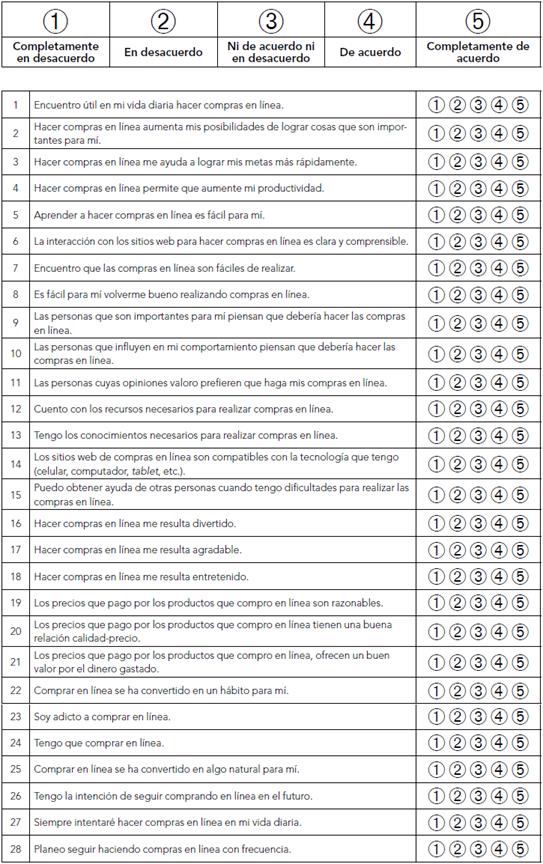 Para cumplir el objetivo de la investigación de identificar cuáles son los factores determinantes para los consumidores en su intención de realizar compras en línea se usó como base la teoría UTAUT2, teoría que tiene el propósito de comprender, explicar y predecir la aceptación y uso de la tecnología en un contexto de consumo; considerada en el ámbito académico la teoría más completa en la comprensión de la adopción y el uso de tecnología individual; además de ser la teoría que prevalece entre los investigadores particularmente para examinar los problemas centrados en el cliente y por su enfoque en el contexto del consumidor ha sido utilizada en el marketing. Cada uno de los ítems que componen las variables independientes del instrumento de medida original del UTAUT2 se conservó y fueron adaptados en su redacción al contexto de las compras en línea, convirtiéndose en el cuestionario de recopilación de la información.