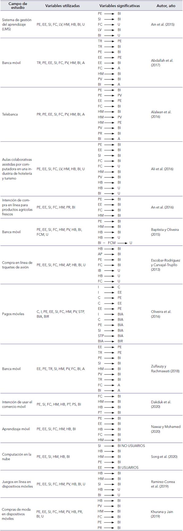 En la tabla 2 se presentan algunas investigaciones que han utilizado el UTAUT2, destacando el campo de estudio, las variables empleadas, las variables significativas, los autores y el año.