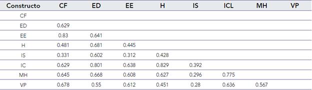 La validez convergente es la medida en que el constructo converge para explicar la varianza de sus ítems. La métrica utilizada para evaluar la validez convergente de un constructo es la varianza promedio extraída (AVE) para todos los elementos de cada constructo. Una AVE aceptable es 0.50 o superior, lo que indica que el constructo explica al menos el 50 % de la variación de los indicadores (Hair et al., 2017, 2019). En esta investigación la AVE arrojó valores entre 0.661 y 0.862 (tabla 3).
