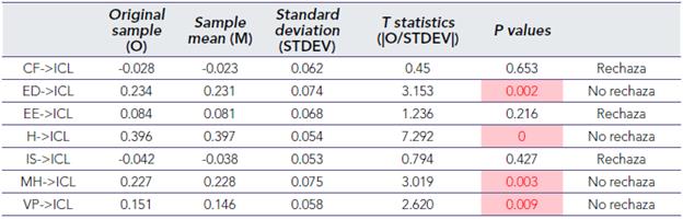 Concluida la fase de evaluación del modelo externo, se evalúa el modelo interno para probar las hipótesis planteadas en este. El modelo interno valida las hipótesis y los resultados del modelo externo combinando las ponderaciones de las rutas. Las hipótesis con un valor t menor que 1.96 o un valor p mayor que 0.05 son rechazadas (Ramírez et al., 2021). En la tabla 8 se muestran los resultados hallados.