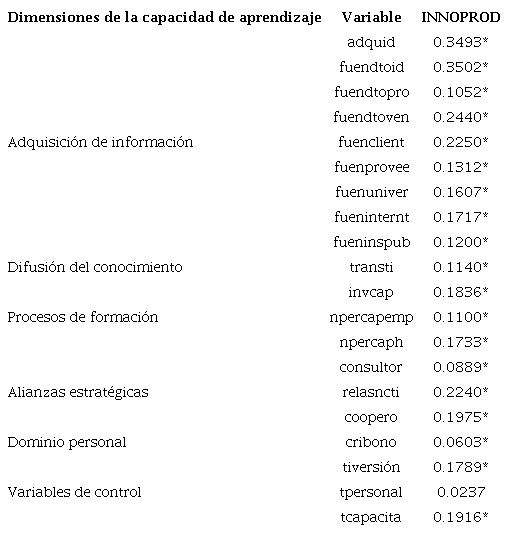 Los resultados se observan en la tabla 1 e indican que la capacidad de innovación y la capacidad de aprendizaje se correlacionan con un coeficiente débil o muy débil, y una asociación positiva y significativa. De manera particular, la capacidad de innovar en productos se correlaciona con la adquisición de información, la difusión del conocimiento, los procesos de formación, las alianzas estratégicas y el dominio personal. Estos resultados son coherentes si se toma en consideración que tener acceso a la información, contar con personal capacitado, con relaciones con otras empresas y con incentivos por desempeño son un requisito para la generación de ideas, lo que facilita el desarrollo de la capacidad de innovación en productos (Senge, 2010).