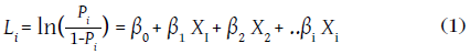 en la que Li hace referencia a la función logit, Ln es el logaritmo natural, es razón de las probabilidades (Pi representa la probabilidad de ocurrencia, 1-Pi es el complemento de la probabilidad), β0 es el coeficiente de la constante, β1 es el coeficiente de regresión asociado con los predictores, X1 son las covariables (Sagaró & Zamora, 2019).
