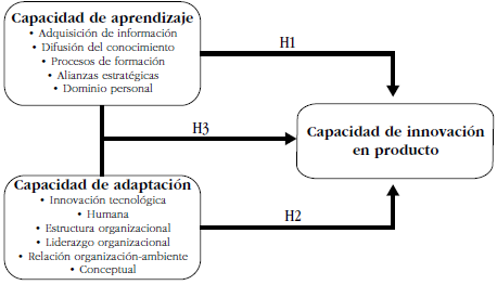 Las hipótesis anteriores plantean que las capacidades de aprendizaje y adaptación influyen individualmente en el desarrollo de la capacidad de innovación en producto, lo que permite sugerir que, cuando ambas capacidades coexisten en una organización, interactúan y potencializan aún más el desarrollo de la capacidad de innovación, por lo tanto, se expone la hipótesis 3.