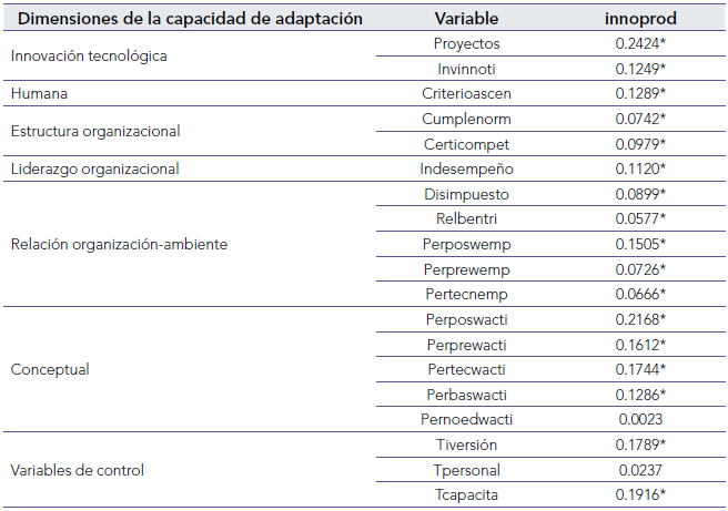 Por otra parte, en la tabla 2 se exponen los resultados de la correlación entre la capacidad de innovación y la capacidad de adaptación. En primer lugar, la capacidad de innovar en productos se correlaciona positiva y significativamente con las dimensiones de innovación tecnológica, humana, estructura organizacional, liderazgo organizacional, relación organización-ambiente y conceptual. Los resultados son coherentes si se considera que, para el desarrollo de innovación en producto, se requiere de nueva tecnología, criterios de ascenso, el monitoreo de indicadores, interactuar con el medio externo, expertos internos y el cumplimiento de normas y reglamentos.