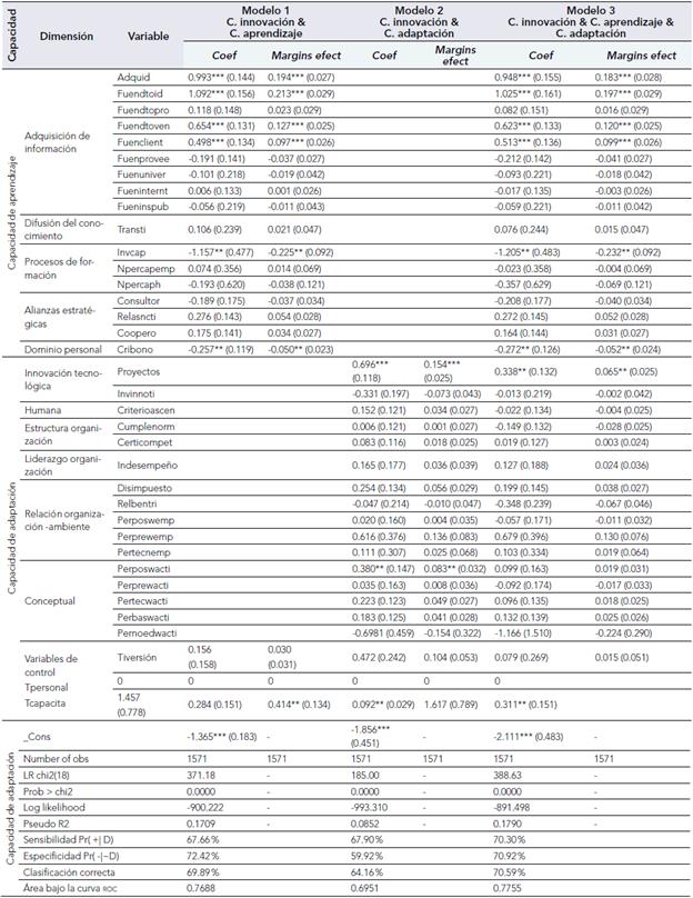 Los resultados de este modelo se presentan en la tabla 3, en la cual las columnas representan la capacidad de innovación en producto y las filas, las variables independientes (capacidad de aprendizaje y adaptación). Se calcularon los coeficientes que muestran si la significancia entre las variables es positiva o negativa; además, se calcularon los efectos marginales que demuestran la probabilidad de ocurrencia (Ballesteros, 2018; Salmerón, 2019).
