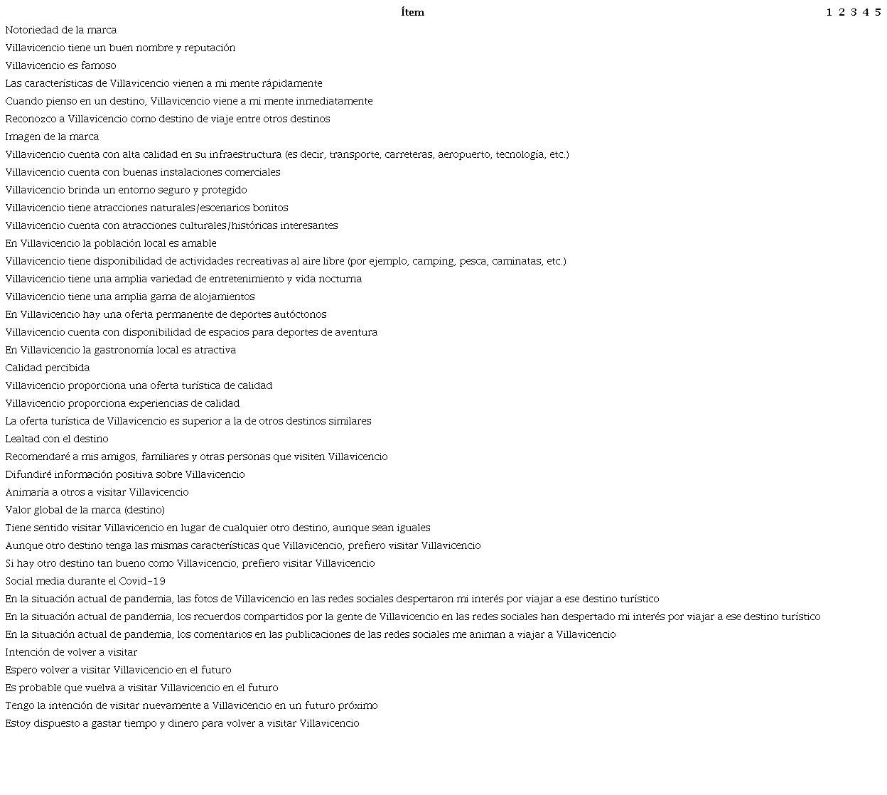 La escala seleccionada para medir la notoriedad de la marca del destino consta de cinco ítems adaptados de Boo et al. (2009) y de Hyunjung et al. (2012). La imagen de marca del destino (12 ítems) y la calidad de marca percibida (3 ítems) se midieron a partir de la escala propuesta por Boo et al. (2009). La lealtad con el destino (3 ítems) se evaluó mediante una escala adaptada de Hasan et al. (2020). El valor global de la marca (3 ítems) se midió utilizando la escala desarrollada por Yoo y Donthu (2001). Para analizar el social media durante el Covid-19 se emplearon tres indicadores de la escala de Rather (2021). La intención de volver a visitar el destino se evaluó a partir de cuatro ítems basados en la escala de Lin y Lekhawipat (2014). Todos los elementos de medición se recopilaron en una escala de cinco puntos, que van desde muy en desacuerdo (1) a totalmente de acuerdo (5), como se aprecia en el anexo 1.