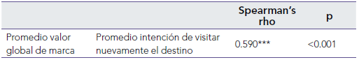 La tercera asociación refiere que el valor global de la marca favorece la intención de visitar nuevamente el destino. Según se observa en la tabla 4, el valor global de la marca se relaciona positivamente con la intención de repetir el viaje a Villavicencio, por lo tanto, existe evidencia que apoya H7.