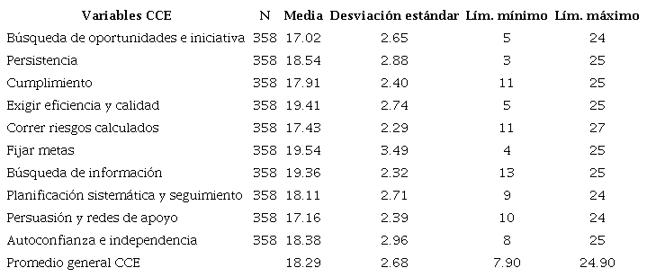 Considerando la muestra en su totalidad (N = 358), vemos que las variables de las CCE que poseen una mayor puntuación por parte de los estudiantes de primer año son fijar metas, exigir eficiencia y calidad, y búsqueda de información. Y aquellas variables de las CCE que poseen una menor puntuación se refieren a la búsqueda de oportunidades e iniciativa, persuasión y redes de apoyo, y correr riesgos calculados.