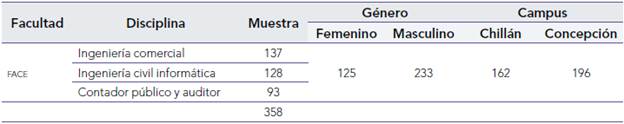 Entre los participantes, se observa que la proporción de género masculino corresponde al 65.08 %, superior que la del género femenino, que corresponde a un 34.92 %. La FACE de la universidad en estudio posee dos ubicaciones geográficas en la zona centro sur de Chile donde se realizan las labores educacionales; según la información obtenida, la mayoría de los estudiantes se encuentra en el campus de la ciudad de Concepción (54.75 %), más que en el campus de la ciudad de Chillán (45.25 %). La muestra también indica que entre las disciplinas universitarias que conforman la FACE y que cursan los participantes están: ingeniería comercial (38.27 %), ingeniería civil informática (35.75 %) y contador público y auditor (25.98 %).