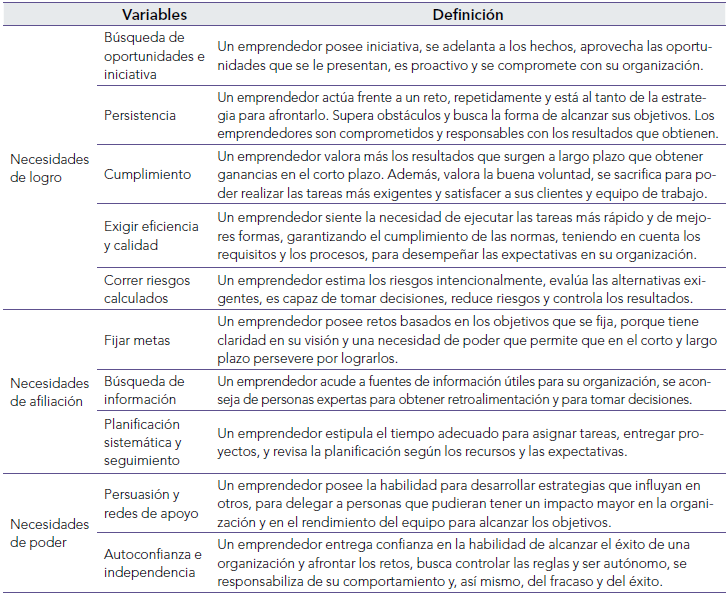 En primer lugar, la necesidad de logro es definida como uno de los comportamientos emprendedores de las personas (McClelland, 1989). Esta necesidad se asocia a aquellos comportamientos que se orientan a la propuesta de metas y objetivos personales, sociales y económicos. Esto permite que los seres humanos o emprendedores puedan demostrar y sobresalir en los esfuerzos que realizan para lograr hacer mejor las cosas. Dentro de esta necesidad se encuentran los comportamientos: de búsqueda de oportunidades e iniciativa, de cumplimiento, de correr riesgos calculados, de persistencia y de exigir eficiencia y calidad. Para Ferreira et al. (2021), el cumplimiento y la persistencia son dos de las más altas competencias valoradas entre emprendedores de diversos sectores económicos, siendo diferentes estas necesidades entre aquellos jóvenes que se identifican con el género femenino y masculino (Villalba & Ortega, 2021).