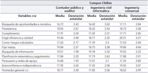 Así también se realiza un análisis descriptivo y comparativo respecto a las variables de las CCE en cada una de las disciplinas que ofrece la FACE respecto a los campus que posee la universidad. Desde la tabla 4 se observa que, en la FACE, en el campus Chillán, la media es superior para ingeniería comercial en lo que respecta a las CCE, comparada con las disciplinas de contador público y auditor, e ingeniería civil informática. Además, se reporta que, en la carrera de contador público y auditor, las variables de las CCE con mayor puntuación son fijar metas, búsqueda de información y exigir eficiencia y calidad; y las de menor puntuación son búsqueda de oportunidades e iniciativa, persuasión y redes de apoyo, y correr riesgos calculados. Siendo esto similar (pero en distinto orden) para la disciplina de ingeniería civil informática, en la que se aprecia que las variables de las CCE con mayor puntuación son búsqueda de información, fijar metas y exigir eficiencia y calidad. Y las de menor puntuación son búsqueda de oportunidades e iniciativa, persuasión y redes de apoyo, y correr riesgos calculados.