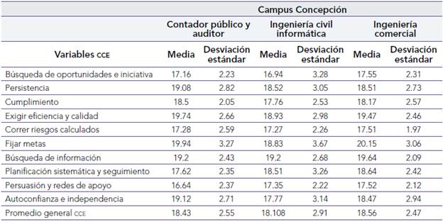 Respecto a las CCE en la FACE en campus Concepción, se observa desde la tabla 5 que la media es superior para ingeniería comercial en lo que respecta a las CCE, comparada con las disciplinas de contador público y auditor, e ingeniería civil informática. Similar a lo que ocurre en el campus Chillán, en el campus Concepción, en las tres disciplinas en estudio se reporta que las variables de las CCE con mayor puntuación son fijar metas, búsqueda de información y exigir eficiencia y calidad.