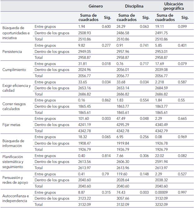 En segundo lugar, para responder a las hipótesis planteadas previamente, se utilizó un Anova de un factor para analizar si las variables de las CCE difieren en las distintas cohortes de interés. Para la hipótesis 1, según la tabla 6, se indica que el Anova establece que las variables de las CCE que generan diferencias significativas para la cohorte género se atribuyen a las CCE de cumplimiento, exigir eficiencia y calidad, y fijar metas. Para la hipótesis 2, el Anova señala que las variables que generan diferencias significativas para la cohorte disciplina (ingeniería comercial respecto a las demás) son exigir eficiencia y calidad, fijar metas y autoconfianza e independencia. Finalmente, para la hipótesis 3, el Anova determina que las variables de la CCE no generan diferencias significativas para la cohorte de ubicación geográfica entre ambos grupos (campus Concepción y Chillán).