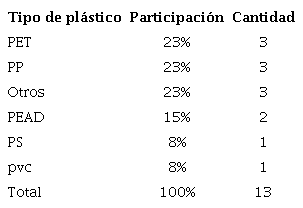 En la tabla 10 se presenta la clasificación y porcentaje dentro de la muestra de los tipos de plásticos usados para los empaques, encontrando en mayor proporción PET, pp y otros (materiales flexibles de baja reciclabilidad compuestos por capas de diferentes plásticos, clasificados con el código 7). En menor proporción se usan PEAD, ps y pvc. En la muestra observada no se encuentran alimentos con empaques de bioplásticos.