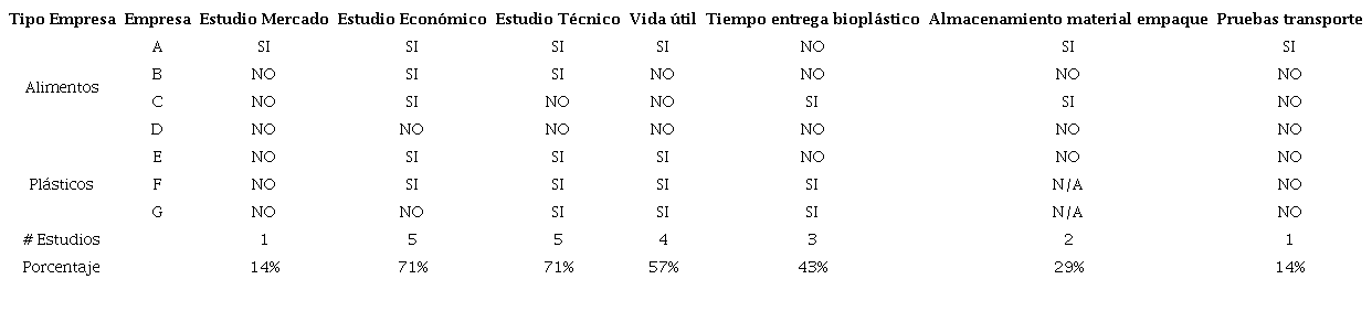En la tabla 11 se observa un resumen de las empresas que han tenido avances frente a la migración a empaques de bioplásticos, ya sea porque lo incorporan en la etapa de empaque, en el caso de las empresas de alimentos, o porque lo demandan los clientes, en el caso de industrias fabricantes de plásticos. Se muestra si han realizado o no estudios de mercado con métricas de clientes potenciales, estudios de viabilidad económica, estudios técnicos de funcionabilidad del empaque, de vida útil del bioplástico y del alimento, análisis de compromisos de tiempos de entrega de los proveedores, análisis de condiciones de almacenamiento del material empaque y pruebas de transporte con productos ya empacados.