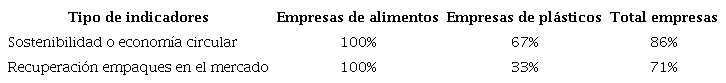 El 100% de los ejecutivos entrevistados tienen conocimiento de la legislación referente a plásticos en Colombia y coinciden en que las disposiciones legales hacen parte del camino para involucrar también al Estado, incluyendo normatividad tanto para las empresas locales como para las empresas importadoras de productos. En la tabla 12 se presentan los resultados por tipo de industria y el total de las empresas que cuentan con indicadores de sostenibilidad o economía circular, e indicadores de recuperación de empaques en el mercado. El 86% de las empresas entrevistadas tienen indicadores de sostenibilidad o economía circular, es decir que solo una no cuenta con estos. Así mismo, gracias a la resolución 1407 de 2018 todas las empresas de alimentos cuentan con indicadores de recuperación de plásticos puestos en el mercado, pero solo una de las tres empresas de plásticos lo tienen. Los entrevistados de la industria del plástico aclararon que si la legislación aplicara también para ellos tendrían los indicadores y realizarían la recolección.