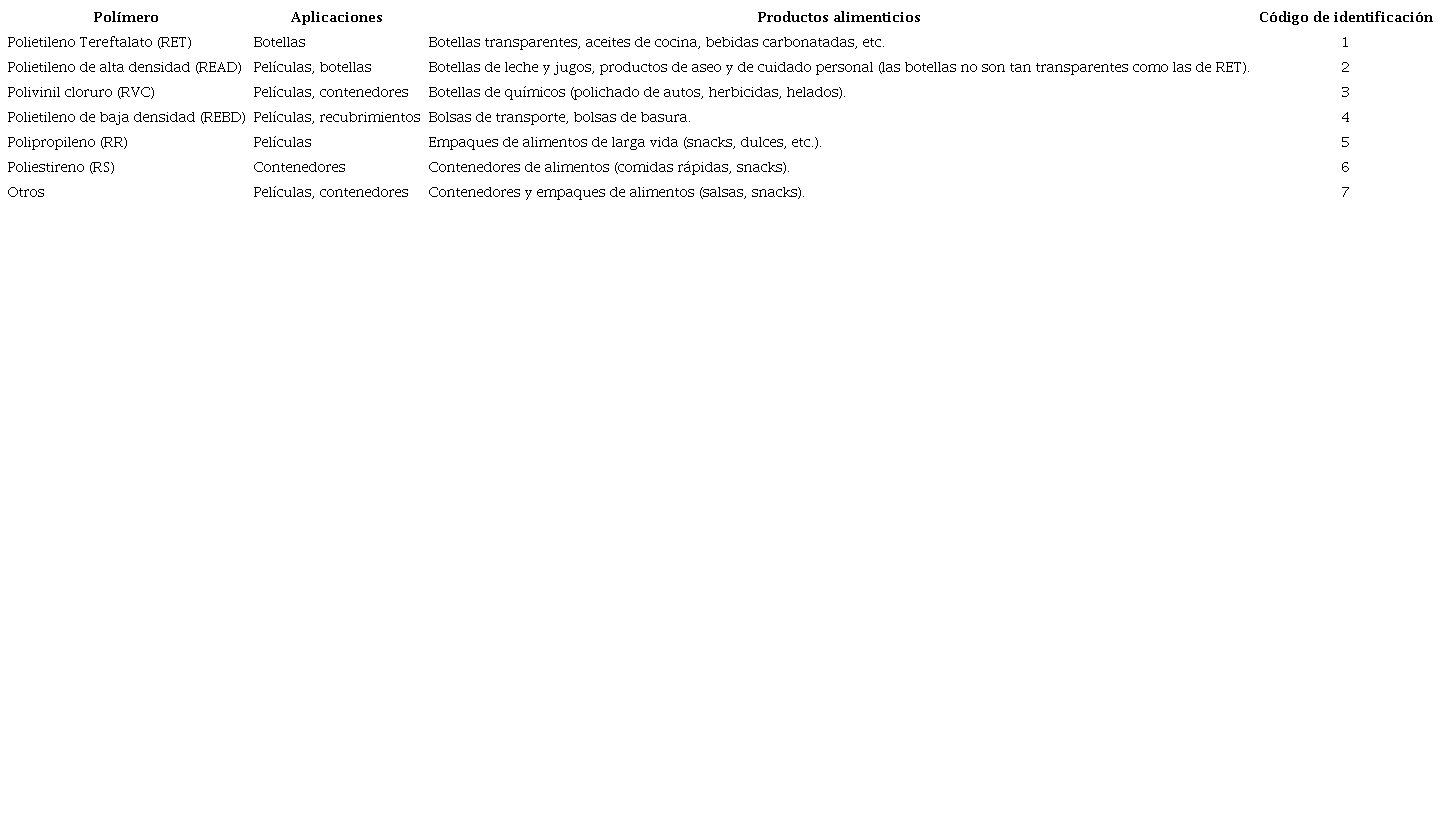 El segmento de mercado más grande en la industria del plástico es el de empaque, cerca de la tercera parte de los plásticos en todo el mundo se transforma en empaques y envases, es decir, aproximadamente 100 millones de toneladas anuales (European Bioplastics, 2020). La Directiva 82/711 de la European Economic Community establece y define el concepto de los plásticos como: "compuesto macromolecular orgánico obtenido por polimerización, policondensación, poliadición u otro procedimiento similar a partir de moléculas de peso molecular inferior o por modificación química de macromoléculas naturales" (Arvanitoyannis et al., 2005). Los plásticos convencionales son polímeros elaborados con materias primas a partir de fuentes de origen fósil. En la tabla 1 se presentan los tipos de plásticos que son usados frecuentemente para empaques, algunas aplicaciones y ejemplos del tipo de productos, y el código de identificación dado por la sociedad de la industria del plástico.