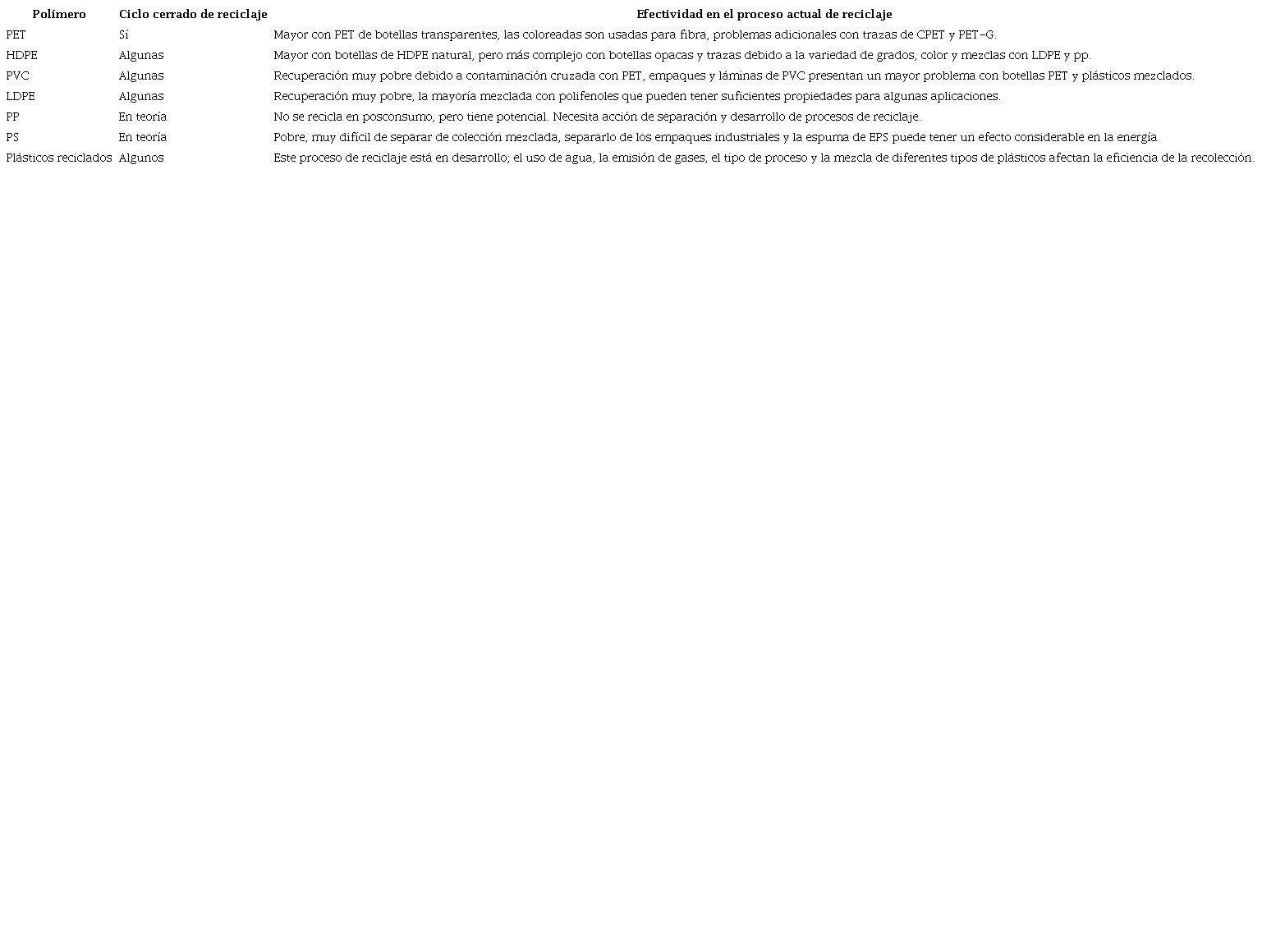 Reciclaje: debe llevarse a cabo de tal manera que minimice el nivel de contaminación a través de su proceso, y que, como resultado, incremente la eficiencia del proceso y conserve la energía. Las tecnologías de reciclaje han sido divididas en cuatro tipos generales: primario, secundario, terciario y cuaternario. El reciclaje primario incluye el procesamiento del residuo en un producto que se desempeñe de forma similar al producto original. El secundario incluye procesos en los que el residuo se convierte en un producto que no es similar a su original. En el reciclaje terciario, combustibles y químicos básicos son producidos a través de residuos plásticos, como parte de la corriente de residuos municipales o como un residuo segregado. El reciclaje cuaternario usa la energía contenida en los plásticos por medio de quemas o incineraciones (Siddiqui & Pandey, 2013). En la tabla 2 se muestra la habilidad actual en Europa para el reciclaje de los principales plásticos usados en empaques, donde el único que tiene ciclo cerrado de reciclaje es el PET.
