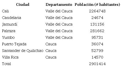El universo (N) objetivo es la población de la ciudad de Cali y los municipios que pertenecen a su zona industrial, en los departamentos de Valle del Cauca y Cauca, para el año 2021, los cuales se observan en la tabla 4.