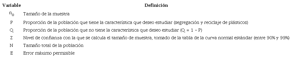 Para las encuestas se calcula el número de muestra o cuestionarios a aplicar con base en el tamaño de la población usando la ecuación 1, las variables se definen en la tabla 5.