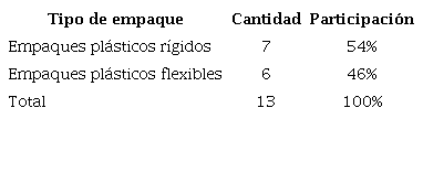 Con el fin de identificar las alternativas de disposición de los materiales actuales para fines comparativos con los bioplásticos, primero se realizó la observación en el mercado para confirmar los materiales que usan las industrias de la región. Se obtuvieron muestras de los productos (snacks, salsas, bebidas y helados) de las cuatro empresas seleccionadas, identificados con los códigos estándar del tipo de material plástico. Es importante tener en cuenta que varias marcas y productos no contaban con la identificación, pero tienen especificado en el empaque el color de bolsa en la cual se debe disponer, cumpliendo con la resolución 2184 de 2019. Dentro de la muestra tomada para varias marcas y en diferentes establecimientos de la región no se encuentran empaques de bioplásticos. La muestra arrojó siete empaques rígidos y seis empaques flexibles como se observa en la tabla 9.