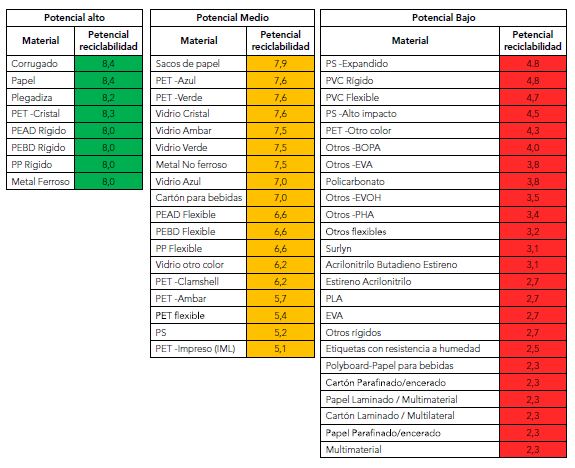 En la figura 1 se presenta el resultado del estudio realizado por la Asociación Nacional de Empresarios de Colombia (ANDI) sobre la reciclabilidad potencial de empaques de alimento usados en Colombia. Dentro de los materiales de alto potencial hay PET cristal, PEAD y PEBD rígidos; en los de potencial medio están el PET rígido de otros colores y el flexible, así como el PEAD y PEBD flexibles; y, finalmente, en potencial bajo está el PS expandido (conocido en Colombia como icopor), el PVC y la mezcla de plásticos.