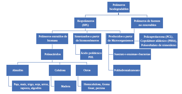 Se denominan "bioplásticos" (BPL) a aquellos materiales plásticos certificados como biodegradables, que tienen su origen en materias orgánicas (recursos agrícolas, forestales y animales), en principio renovables. La figura 2 muestra los diferentes tipos de BPL existentes, clasificados por su origen. Los tipos más comunes de bioplásticos son basados en celulosa, almidón, ácido poliláctico (PLA) y poli-3hidroxibutirato (PHB). Los basados en celulosa son usualmente producidos de pulpa de madera y usados para hacer productos tipo películas, como envolturas.