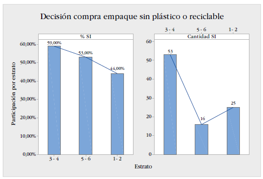 De igual manera se presentan los resultados sobre las preferencias de compra, ya que diferenciando por edades el 71% de las personas entre 40 y 55 años dentro de su criterio de decisión, evitan plásticos o prefieren que el empaque sea de un material más sostenible, mientras que solo un 34% de los menores de 20 años lo tienen en cuenta, lo cual está asociado al poder adquisitivo. El comportamiento también se puede diferenciar por estratos, como se refleja en la figura 3, dado que el material influye en la decisión de la compra en mayor proporción en los estratos 3 y 4 con 59%, seguido por un 53% de los estratos 5 y 6, y el más bajo es de los estratos 1 y 2 con 44% de las personas respondiendo afirmativamente a la consulta.