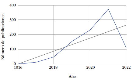 Los resultados presentados en la figura 1 indican que las primeras publicaciones registradas en Scopus, referentes al campo de estudio, se originaron en el año 2016 con los documentos titulados "Un sistema de trazabilidad de la cadena de suministro agroalimentaria para China basado en la tecnología RFID y blockchain" y "¿Revolucionará la tecnología blockchain la gestión de la cadena de suministro de excipientes?". Desde entonces se ha marcado una tendencia creciente de publicaciones alcanzando su máximo en el 2021 con 373 documentos registrados; se espera que la tendencia creciente continúe en el año 2022, teniendo en cuenta que el número de documentos publicados es de 108 hasta la fecha de consulta.