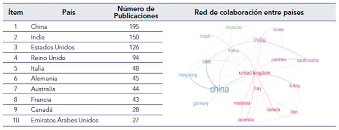 Los diez países líderes respecto al número de publicaciones se presentan en la tabla 2, donde China se ubica en el primer lugar con 195 documentos, que representan el 21% del total, seguido por India (150 publicaciones) y Estados Unidos (126 publicaciones) con el 16% y 14%, respectivamente. Asimismo, los países de Europa del listado (Reino Unido, Italia, Alemania y Francia) presentan una participación conjunta de 230 publicaciones con una ponderación del 25 % aproximadamente. Con respecto a investigaciones desarrolladas entre países, la red identifica una fuerte relación de China con Estados Unidos, Hong Kong, Alemania y Reino Unido, principalmente. En términos de colaboración entre países, después de China, India es quien lidera la relación con países como Arabia Saudita y Corea.