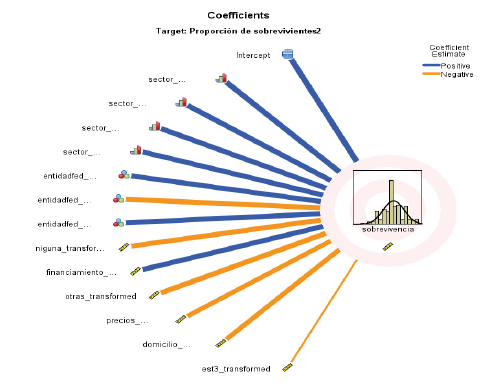 Como se observó desde el análisis descriptivo (Figura 3), que coincide con la figura 5 y la tabla 6a, se observa que las entidades federativas más castigadas por el periodo contingente fueron Quintana Roo y Colima. Por otro lado, tanto el análisis de regresión como la modelación automática lineal muestran que la única variable positiva para la sobrevivencia fue el financiamiento y que las variables como ajuste de precios y entrega a domicilio, fueron negativas (Figura 6).