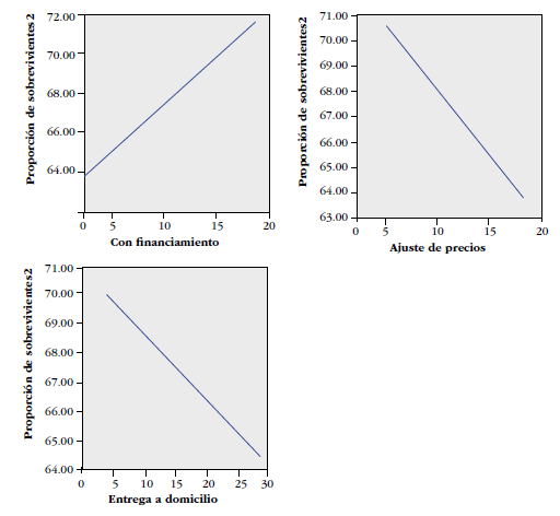 Las variables que explican negativamente la sobrevivencia son educación media y superior, entrega a domicilio, ajuste de precios, otras y ninguna. Esto quiere decir que a mayor contratación de personal con educación media y superior, así como estrategias de entrega a domicilio, etc., la sobrevivencia disminuyó. Una hipótesis derivada de esto es que el ajuste de precios y la entrega a domicilio son costosas y eso puede generar pérdidas y desaparición de la empresa. En contraste, las variables que explican positivamente la sobrevivencia son financiamiento y sin estudios.