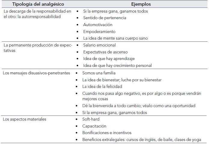 De los analgésicos organizacionales rastreados durante el análisis, se hizo una agrupación de acuerdo con su naturaleza. En esta sección se exponen los analgésicos y en la siguiente se presenta la discusión. Se encontraron cuatro tipos de analgésicos, que se describen por ser recurrentes y naturalizados. La descarga de la responsabilidad en el otro o el sentido de autorresponsabilidad consiste en que se le asigna o entrega la responsabilidad al trabajador; es él quien debe asegurar, por ejemplo, automotivación o sentido de pertenencia. En segundo lugar aparece la permanente producción de expectativas, se trata de un conjunto de píldoras que se observan desde los procesos de selección, cuando se le dice al candidato "aquí usted puede progresar'; incluso confundiendo progreso social con progreso económico (de Gaulejac & Hanique, 2015). En tercer lugar, están los mensajes disuasivos, que consisten en ideas penetrantes que se escuchan en las inducciones, las capacitaciones y los contextos organizacionales; por ejemplo: "somos una familia". Finalmente, si esos analgésicos no son suficientes, y se requiere ir a otro nivel de intensidad, existen otras píldoras que se pueden llamar los aspectos materiales. Se trata de aquellas cosas que la empresa da a los empleados y que, de alguna manera, son más tangibles, como por ejemplo la capacitación y este o aquel incentivo económico. Esos grupos de analgésicos se presentan resumidos en la tabla 3, con sus respectivos ejemplos, tomados de las entrevistas. Durante esta sección y la siguiente, las expresiones tomadas de los entrevistados se ponen en cursiva.
