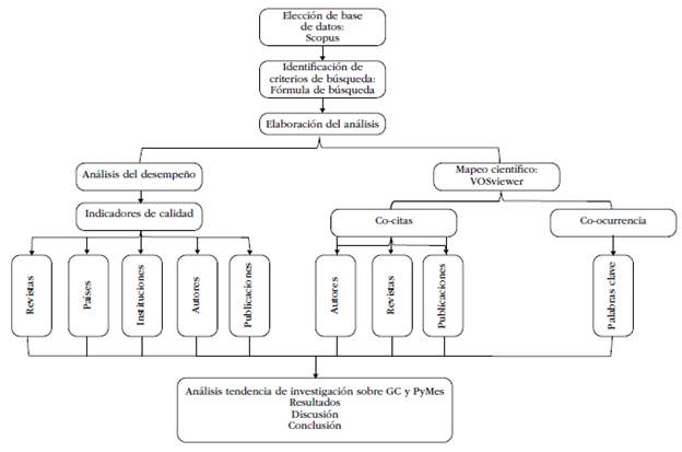 El artículo es un revisión sistémica a partir de un análisis bibliométrico, con el fin de evaluar el progreso, la evolución, la relaciones exponenciales y la producción científica sobre la GC y las pymes. En lo que se refiere a la búsqueda de los documentos en la base de datos Scopus, esta se llevó a cabo a través del campo buscar dentro (título de artículo, resumen y palabras clave), específicamente dentro del espacio de buscar documentos, que permitió un análisis en forma conjunta, es decir, generó los resultados en un mismo momento con ambas variables, mediante el uso de palabras clave.