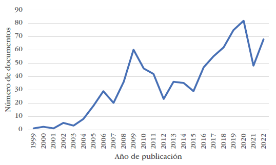 El progreso y la evolución de las publicaciones sobre la GC y las pymes se puede observar en la Figura 2. Según información de Scopus, la primera publicación fue en 1999: "Knowledge management as a service: Co-operation between small and medium-sized enterprises (SMES) and training, consulting and research institutions", la cual aborda las pymes y los proveedores externos de conocimiento técnicos, aclara la falta de transparencia en el mercado, así cómo la ausencia de cooperación en la transferencia de saberes. En la misma figura se detecta una aceleración en cuanto a publicaciones a partir del 2003 hasta el 2006; posterior a ello, se detecta una desaceleración en publicaciones, que retoma fuerza en el 2009. Sin embargo, nuevamente se ve afectada la productividad para los años posteriores, es hasta 2020 cuando se observa el mayor incremento en la productividad sobre la GC y las pymes: rebasa las 80 publicaciones.