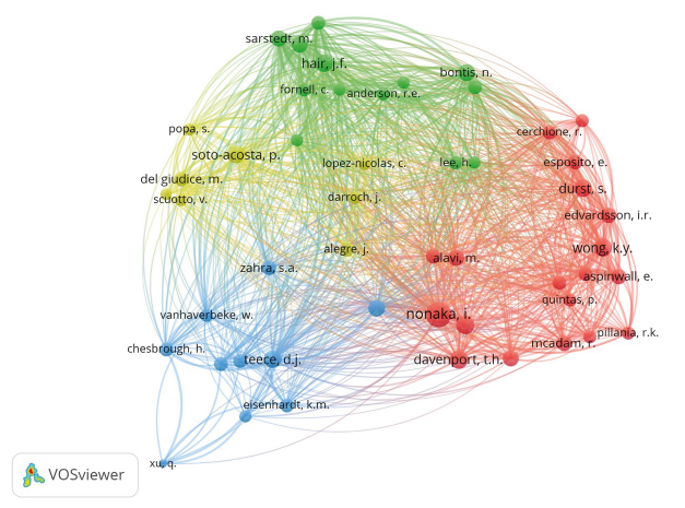 De acuerdo con la Figura 4, la colaboración entre autores se constata con la formación de cuatro clústeres, el principal de ellos con 19 ítems y resaltado en color rojo, donde se encuentran autores como Nonaka I., teórico organizacional japonés y profesor emérito de la Graduate School of International Corporate Strategy de la Universidad Hitotsubashi, más conocido por su estudio de la GC, con un total de 536 citas y con el mayor Total Link Strength o fuerza total del enlace (FTE) dada en 5769, qué indica la "fuerza entre los vínculos de coautoría entre un investigador determinado con otros investigadores" (Van & Waltman, 2022, p. 6).