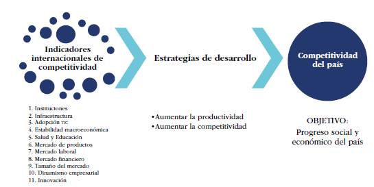 Corredor González (2015) establece que la competitividad es una herramienta axiomática que se refiere a la intención y operación de las políticas y acciones del país, así como a la acción de mejorar sus referentes de buenas prácticas a partir del cumplimiento de estándares internacionales que facilitan la entrada y acceso a nuevos mercados y la incursión diversificada en iniciativas empresariales. Niño Rodríguez et al. (2018) señalan que esta se puede analizar desde dos ángulos: una serie de factores que indican el nivel de productividad y como un medio del crecimiento continuo del bienestar humano. Argumentan, además, que la competitividad actualmente es definida por una serie de posiciones establecidas por escuelas y organismos internacionales relacionadas con la evaluación sobre la viabilidad de los países en ese tema. Medeiros et al. (2019) contemplan el concepto de competitividad como eficiencia, ya que el objetivo es saber cómo funcionan los países en desarrollo, para ese propósito es importante el análisis de los factores diferenciales. Por lo tanto, la competitividad es la capacidad de una organización para desarrollar y aplicar estrategias competitivas que permitan un crecimiento sostenido de la cuota de mercado. Asimismo, el Foro Económico Mundial (FEM) señala que la competitividad nacional es un conjunto de instituciones, políticas y factores que indican la productividad del país (SNCCTI, 2016) y debe mantenerse un crecimiento sostenible del PIB per cápita. Lo que todas estas posturas tienen en común frente a la competitividad (figura 1) es que esta se refiere al análisis de los factores que inciden en la productividad del país y, con ello, el incremento en la prosperidad de la economía nacional (SNCCTI, 2016).