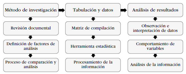 El proceso de investigación se llevó a cabo en tres fases (figura 2). La primera correspondió a la metodología de la investigación e incluyó una revisión de informes de entidades gremiales, gubernamentales y sectoriales (2010-2021). Este proceso dio inicio al análisis de la competitividad de Colombia frente a los países de América Latina en el periodo 2010-2021 y a la definición de variables de análisis a partir de la exploración documental -organización y clasificación de la información para posterior unificación de las variables para facilitar el proceso de identificación, comparación y análisis de estas variables-.