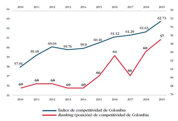 La competitividad cumple una función elemental en la economía nacional por ser una condición necesaria para la creación de nuevos escenarios posicionales a nivel nacional e internacional. En esta sección se presentan los resultados del análisis de la posición competitiva del país a nivel mundial y, a su vez, su posición frente a los países de América Latina, así como la evolución de la posición competitiva de Colombia en el periodo 2010-2019 según el ICO, que mide la competitividad y evalúa los factores que impulsan la productividad y el crecimiento en economías a nivel mundial; es construido por el "Foro Económico Mundial, que mide la capacidad de un país para lograr un crecimiento económico sostenible en el mediano plazo" (SNCCTI, 2016).