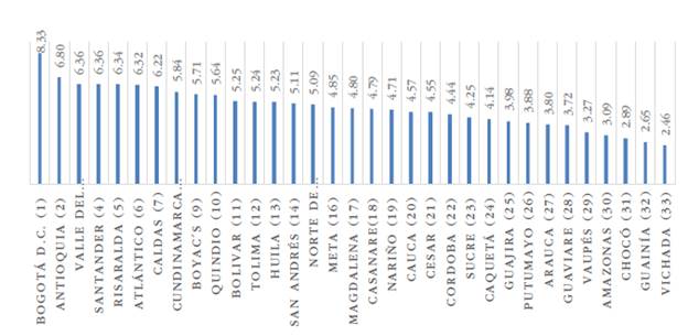 En el informe 2020-2021, las primeras cinco posiciones las ocuparon Bogotá D. C. (1) y los departamentos de Antioquia (2), Valle del Cauca (3), Santander (4) y Risaralda (5) (figura 4). Mantuvieron su posición respecto al año anterior Bogotá D. C., Antioquia, Santander y Risaralda. Mientras que las últimas posiciones fueron ocupadas por los departamentos de Vaupés, Amazonas, Chocó, Guainía y Vichada (CPC, 2021).