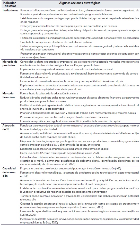 Una vez identificados los indicadores que mostraron retroceso en el periodo 2017-2021, que representaron un desafío significativo en la competitividad del país, se recomiendan algunas acciones estratégicas para mejorar la competitividad a nivel nacional y, por ende, regional (tabla 5).