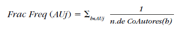 El índice de autoría fraccional es una medida utilizada en bibliometría para evaluar la contribución de un autor en coautoría de artículos científicos. Este se calcula considerando el número de coautores que participan en la producción científica y la cantidad de documentos en coautoría en los que un autor específico ha participado. Para el cálculo se sigue la siguiente ecuación: