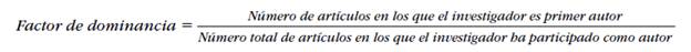 El factor de dominancia es una proporción que indica la fracción de artículos de varios autores en los que aparece un erudito como primer autor (Kumar & Kumar, 2008), para el cálculo se sigue la siguiente ecuación: