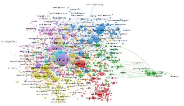 El análisis bibliométrico reveló el conocimiento existente y las prioridades en investigación en temas que son de gran trascendencia para el retail moderno, centrado en la venta minorista, el comercio minorista, la interacción con el cliente, la creación de valor y la optimización de la cadena de suministros, con una incidencia directa de la inteligencia artificial y la realidad virtual para mejorar la experiencia de los clientes. Indiscutiblemente, todo el apoyo de las nuevas tecnologías y el desarrollo del mercadeo digital seguirán potencializando toda la experiencia de servicio y de consumo a gran escala (Amit & Kameshvari, 2012; Kotler & Armstrong, 2018; Sivaraman & Vijayan, 2020).