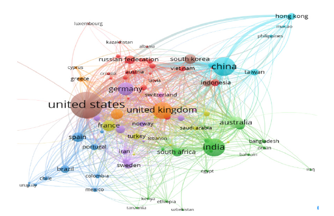 En la Figura 2 se observa la coocurrencia de países: la cooperación que entre países. Estados Unidos, por ejemplo, ha publicado 206 documentos con China, 95 con Canadá, 75 con Corea y 71 con Reino Unido; por su parte, China ha publicado 74 con Hong Kong, 53 con el Reino Unido y 43 con Australia, y Reino Unido ha publicado 39 documentos con Italia, 38 con Australia y 35 con Francia. Finalmente, India ha publicado 29 documentos con Reino Unido, 20 con Australia y 11 con Francia. Estos son los países más relevantes de la muestra.