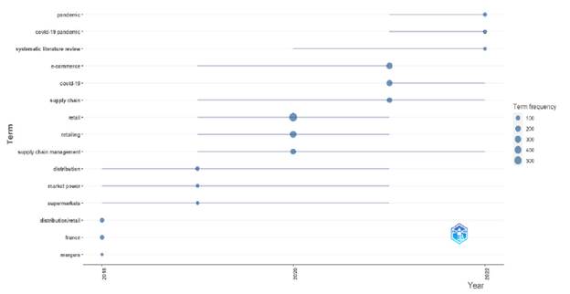 En las figuras 3 y 4 se observan las tendencias temáticas del retail. La primera presenta un número amplio de frecuencia de conceptos como e-commerce, retail y supply chain, los temas que se han venido desarrollando en los últimos años. La segunda expone las temáticas que serán importantes para el desarrollo del retail: todo lo relacionado con el consumidor en términos de su lealtad, compromiso, satisfacción, y con la innovación relacionada con la experiencia de consumo; así mismo, presenta el tema de distribución como uno que continúa siendo el motor de las investigaciones actuales.