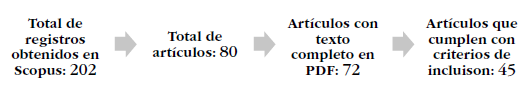 Para el caso del análisis bibliométrico se realizó una consulta en Scopus para definir el número de documentos asociados a la gestión del conocimiento y al ci en la educación superior, a partir de la siguiente ecuación booleana: TITLE-ABS-KEY (knowledge management» AND «Intellectual capital» AND education). Se obtuvieron 202 documentos, de los cuales 80 corresponden a artículos de investigación, elegidos para análisis en texto completo.